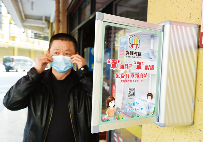 近日,浙江義烏福田街道興隆社區(qū)在轄區(qū)內(nèi)主干道出入口、人員密集的超市、藥店、快遞點(diǎn)等地設(shè)置免費(fèi)口罩領(lǐng)取箱,箱里放滿了口罩,箱體上寫著“文明領(lǐng)取,每人限領(lǐng)一個(gè)”。活動(dòng)開展半個(gè)月以來(lái),6個(gè)免費(fèi)口罩領(lǐng)取箱共送出近6000個(gè)口罩。興隆社區(qū)黨委書記黃俊鋼表示,除了設(shè)立免費(fèi)口罩領(lǐng)取箱,社區(qū)還大力開展佩戴口罩勸導(dǎo)活動(dòng)。(錢旭升)