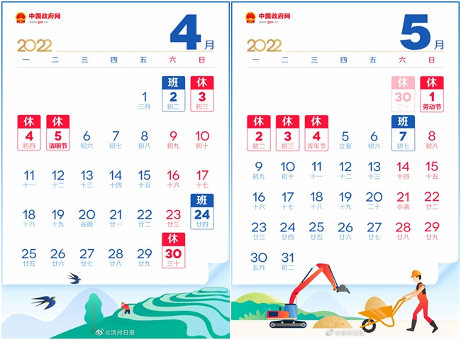 根據(jù)國(guó)務(wù)院辦公廳通知精神,現(xiàn)將2022年勞動(dòng)節(jié)放假安排通知如下: 4月30日(星期六)至5月4日(星期三)放假調(diào)休,共5天。4月24日(星期日)、5月7日(星期六)上班。 請(qǐng)廣大市民提前安排好工作生活,節(jié)日期間注意安全,減少人員聚集,加強(qiáng)個(gè)人防護(hù),度過一個(gè)歡樂、祥和的節(jié)日假期。