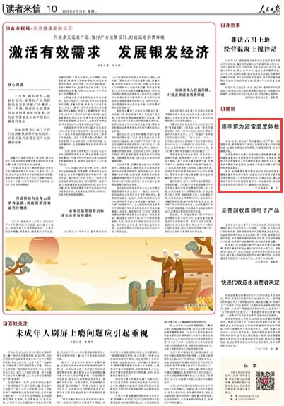 人民日報刊發(fā)南通讀者來信:雨季前為避雷裝置體檢