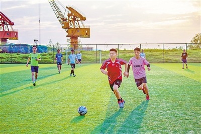 4月9日,在利用廢舊碼頭改造而成的安徽省銅陵市濱江生態(tài)體育公園,足球愛好者競逐綠茵,不遠(yuǎn)處的碼頭吊臂高高矗立。近年來,各地注重盤活城市空閑土地,通過新建或改擴建體育公園、公共體育場館等,加大全民健身場地設(shè)施供給。