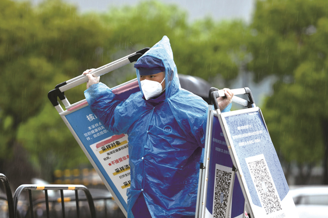 4月13日,在嘉興市區(qū)三元路上的新嘉街道核酸采樣點(diǎn),來(lái)自嘉興藍(lán)天救援隊(duì)的志愿者們?cè)诖笥曛袌?jiān)守,協(xié)助完成核酸采樣。(王振宇)