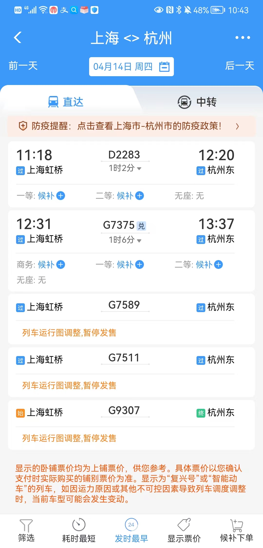 以查詢4月14日上海-杭州的火車票為例,僅剩的5趟列車中,D2283、G7375只是從上海虹橋站經過,車票售罄是因為買票的幾乎都是別的城市上車的旅客,實際從虹橋站上車的旅客幾乎沒有;另外兩趟在上海虹橋站的過路車(G7589、G7511)和一趟始發(fā)車(G9307)干脆已暫停發(fā)售車票,更不存在大量上海出發(fā)旅客買票的可能。