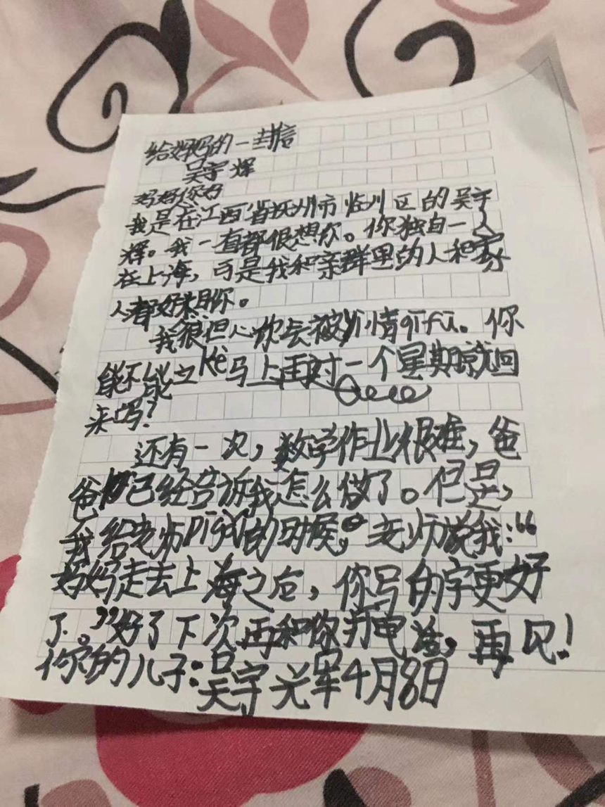 4月8日,張沖華的微信收到一條來(lái)自婆婆的消息,點(diǎn)開(kāi)一看,原來(lái)是兒子的手寫信。“我一直都很想你……”剛看開(kāi)頭,張沖華就抑制不住哭了起來(lái)。