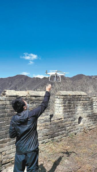 翼展近2米的固定翼無人機、搭載著5個鏡頭的傾斜攝影無人機、白色的小型無人機……4月14日早上,記者驅(qū)車下了京承高速、經(jīng)過雁棲島,又走了30多公里盤山路,來到被箭扣長城環(huán)抱的雁棲鎮(zhèn)西柵子村。村西長城腳下,五架無人機一字排開,技術(shù)人員正在組裝調(diào)試。當天,它們分工合作在長城內(nèi)外、上下進行拍攝、采集數(shù)據(jù)。