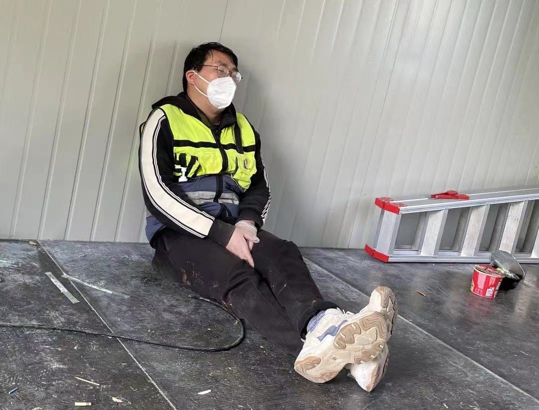 “3月底的上海,還有點冷,沒有被子蓋,我們就裹著衣服,每天只能睡不超過兩小時。”上海建工集團副總工程師王美華是施工現(xiàn)場為數(shù)不多的女性?,F(xiàn)場24小時不停工,工人兩班倒,交班后就地鋪板睡覺,但應急指揮部管理人員要隨時待命,解決現(xiàn)場各類問題,只能找間隙蜷縮在車里休息一下。