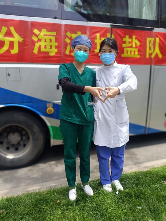 梁慧和姜蕾蕾一樣,在江蘇省鹽城市濱??h第一人民醫(yī)院腦外科任職護(hù)士。作為一名擁有8年黨齡的老黨員,在得知上海需要支援時(shí),她毫不猶豫地在單位報(bào)名加入了江蘇省援滬醫(yī)療隊(duì)鹽城濱海分隊(duì)?!拔抑辣砻靡言谝痪€日夜奮戰(zhàn)了一個(gè)多月了,這一次,我們姐妹倆也算是一起并肩作戰(zhàn)了”,梁慧笑著說道。