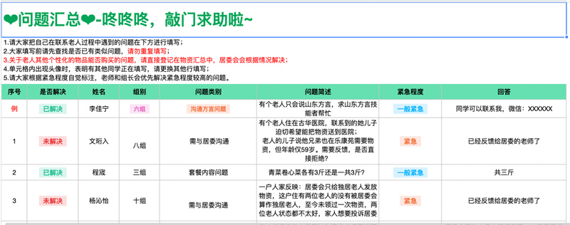 大學(xué)生志愿者團(tuán)隊(duì)負(fù)責(zé)人之一、2018級(jí)漢語(yǔ)言文學(xué)專業(yè)本科生李佳寧,設(shè)計(jì)了共享文檔,用于發(fā)布活動(dòng)通知、匯總聯(lián)絡(luò)情況、提供答疑互助,為志愿者團(tuán)隊(duì)線上管理過程中的工作信息高效互通提供有利保障。符合青年學(xué)生信息溝通習(xí)慣的聯(lián)絡(luò)方式,得到了志愿者成員的一致認(rèn)同,陸續(xù)被充實(shí)的一條條聯(lián)絡(luò)記錄和心得體會(huì),架起了老年人“數(shù)字鴻溝”的橋梁。