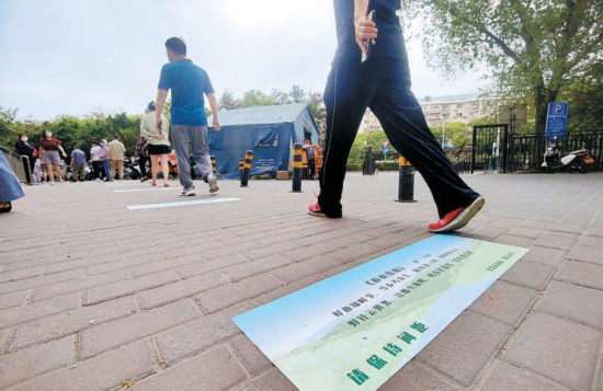 本報訊(實習記者 張佳琪)“這首詩我學過,是朱熹的《偶成》——少年易老學難成,一寸光陰不可輕?!弊蛱?,在海淀區(qū)羊坊店街道蓮花小區(qū)的中心廣場,許多家長和孩子正一起讀詩。有別于尋常親子共讀的是,這一幕出現(xiàn)在核酸采樣的隊伍里。地貼上的一首首詩,替代了普通的兩米線,家長和孩子在排隊的同時品讀古詩,一舉兩得。