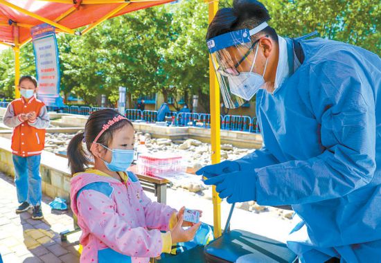 昨天清晨,天剛蒙蒙亮,鄭爍就到達(dá)集結(jié)點位。核酸檢測開始后,鄭爍主要負(fù)責(zé)現(xiàn)場秩序維護(hù)引導(dǎo)、掃碼登記、查驗健康寶、協(xié)助老年人做好信息登記等工作?!白蛱毂本┑淖罡邭鉁剡_(dá)到32攝氏度,核酸檢測期間,我們志愿者小組為上千位居民提供了服務(wù),這期間一個跟著媽媽來做核酸的小女孩每路過一位志愿者都會主動說一聲‘叔叔阿姨,辛苦了!’聽著孩子甜美的問候,再累也值了!”鄭爍告訴記者。