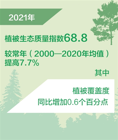 監(jiān)測結果表明,2021年植被生態(tài)質量指數(shù)為68.8,較常年(2000—2020年均值)提高7.7%。與2020年相比,2021年植被生態(tài)質量指數(shù)提高0.4%,其中植被覆蓋度增加0.6個百分點,植被凈初級生產力增加0.7克碳/平方米。
