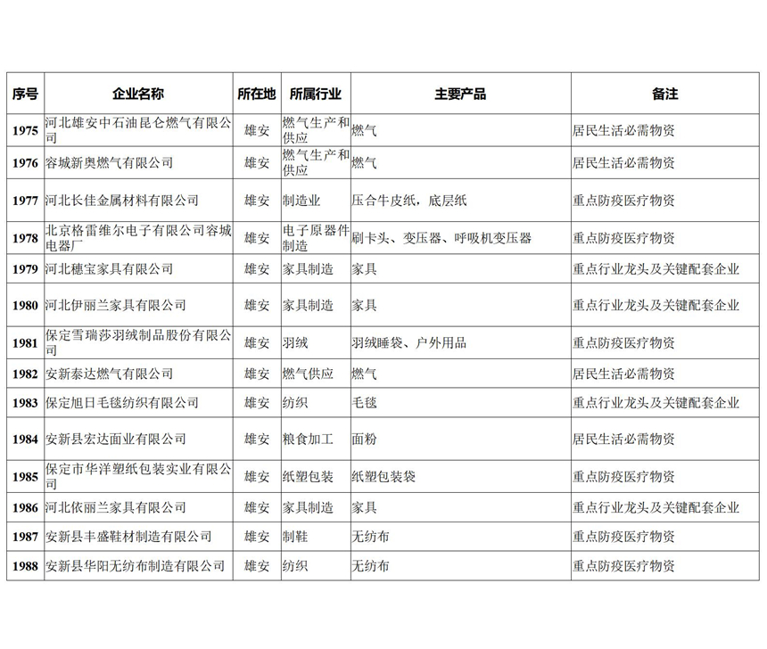 日前,河北省工信廳發(fā)布河北省首批重點(diǎn)產(chǎn)業(yè)鏈供應(yīng)鏈企業(yè)“白名單”,圍繞重點(diǎn)防疫醫(yī)療物資、居民生活必需物資、春耕備耕重要物資、戰(zhàn)略性新興產(chǎn)業(yè)關(guān)鍵物資、重點(diǎn)行業(yè)龍頭及關(guān)鍵配套企業(yè)等五個(gè)方面,共計(jì)1988家,其中重點(diǎn)防疫醫(yī)療物資企業(yè)258家、居民生活必需物資企業(yè)359家、春耕備耕重要物資企業(yè)50家、戰(zhàn)略性新興產(chǎn)業(yè)關(guān)鍵物資企業(yè)426家、重點(diǎn)行業(yè)龍頭及關(guān)鍵配套企業(yè)895家。