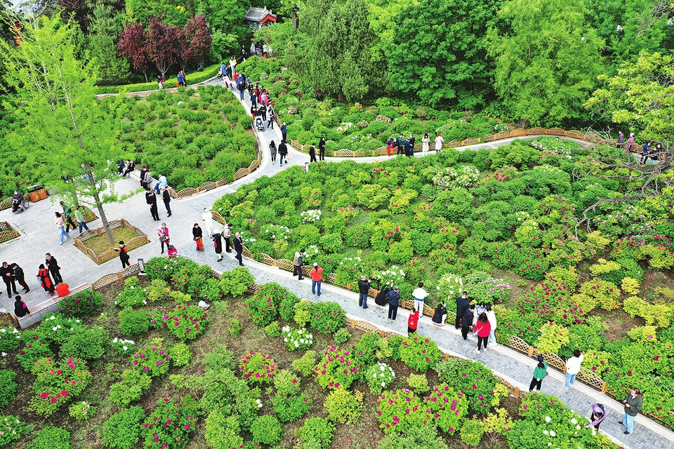 近日,太原迎澤公園牡丹園內(nèi),200多個品種、3000余株牡丹競相盛放,吸引了不少游客前來觀賞,呈現(xiàn)出人與自然和諧相融的綠色生態(tài)畫卷。圖為5月6日,從空中鳥瞰太原迎澤公園牡丹園。(記者李兆民攝)
