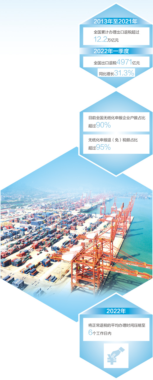 近年來,稅務(wù)總局持續(xù)擴(kuò)大無紙化申報(bào)覆蓋范圍,大幅減輕出口企業(yè)申報(bào)負(fù)擔(dān)。目前,全國無紙化申報(bào)企業(yè)戶數(shù)占比超過90%,無紙化申報(bào)退(免)稅額占比超過95%;稅務(wù)總局正會同相關(guān)部門研究推出進(jìn)一步提高出口退稅便利度等支持舉措,2022年內(nèi),正常退稅的平均辦理時(shí)間將壓縮至6個(gè)工作日內(nèi)。