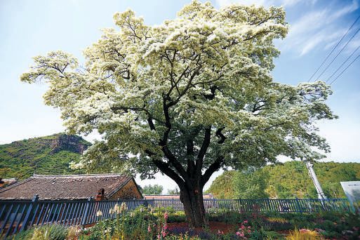 本報訊(記者 王可心)日前,密云區(qū)新城子鎮(zhèn)蘇家峪村一株古流蘇樹進入盛花期,作為北京市屈指可數(shù)的古流蘇樹,不僅因花枝觀賞性強受到民眾喜愛,更因其歷史價值而被廣泛關注。據(jù)了解,流蘇樹系北京市二級保護野生植物?!拔覀兇暹@株流蘇樹是一級古樹,據(jù)專家推斷,至今已有近600年歷史?!碧K家峪村黨支部書記王銀江介紹,該樹高約13米,主干到1.3米處分為兩主枝,向上延展成蘑菇形樹冠,平均冠幅約16米?;ㄆ陂_滿潔白的流蘇花,遠觀如覆霜蓋雪,流蘇細穗隨風搖曳,清香怡人。供圖/密云區(qū)委宣傳部