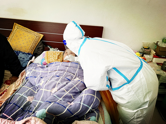 “暖心大白”為行動不便的老人上門做核酸。 樂亭縣委宣傳部供圖