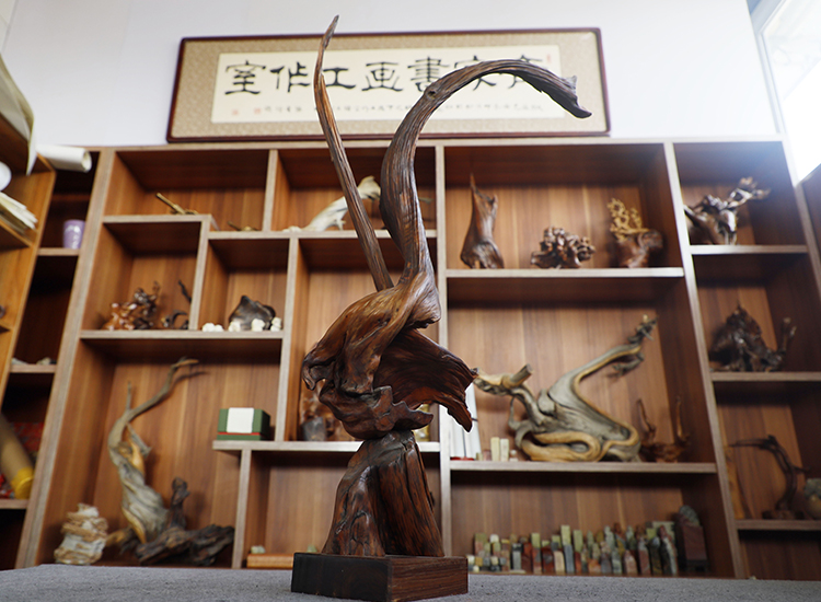 在眾多作品中,王洪義最喜歡的還是一件雄鷹展翅的根雕,這件作品保留了老槐木樹根的形態(tài)特性,利用刻刀、鋼絲等工具將雄鷹豐滿的羽翼刻畫得惟妙惟肖,達(dá)到了在遼闊蒼穹中,迎風(fēng)翱翔的意境。王洪義說:“這件作品跟我本人的經(jīng)歷很像,面對(duì)困境,總有一種不屈的精神,每次看到它,心里總會(huì)充滿一種力量,迎接各種挑戰(zhàn)?!保ń饬⒔?jīng))