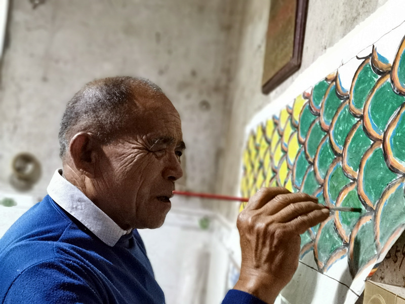 上完課,跟隨羅德書來到他的家里。只見畫好龍麒麟的油紙被當(dāng)成裝飾品掛在墻上,雨壇彩龍的半成品隨處可見。