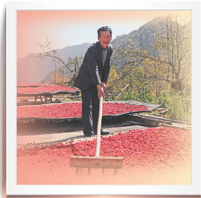陜西省洋縣金水鎮(zhèn)牛角壩村村民在晾曬山茱萸。