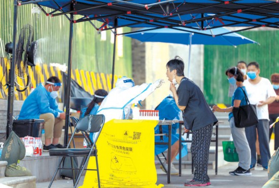 北京28日迎來今年首個高溫日,為應(yīng)對高溫,北新橋地鐵站附近的核酸檢測點,設(shè)置遮陽篷、風(fēng)扇等設(shè)施,確保檢測順利進(jìn)行。本報記者 潘之望攝