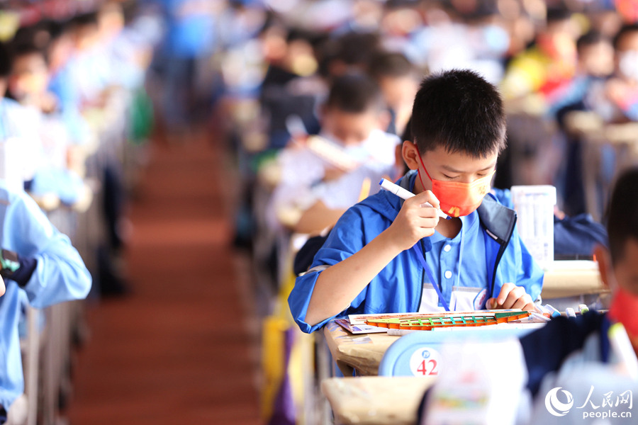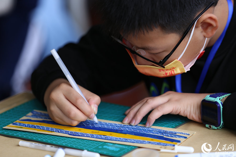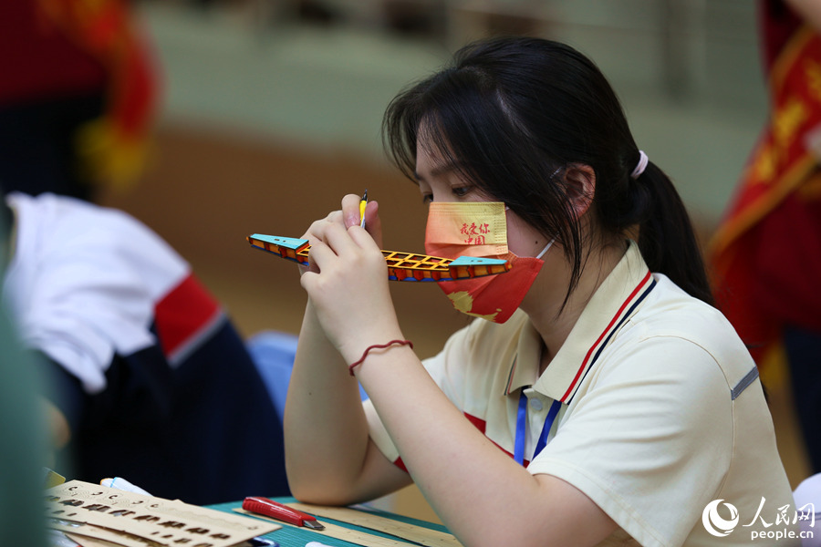 活動(dòng)現(xiàn)場(chǎng),選手們列隊(duì)進(jìn)入各自賽場(chǎng),用畫筆在龍舟模型素材板上畫出各式圖案,再將一個(gè)個(gè)零部件手工拼接,組裝成一條條獨(dú)具特色的“小龍舟”,船體或是金銀鱗甲,或是祥云波浪,色彩斑斕,風(fēng)格不一。