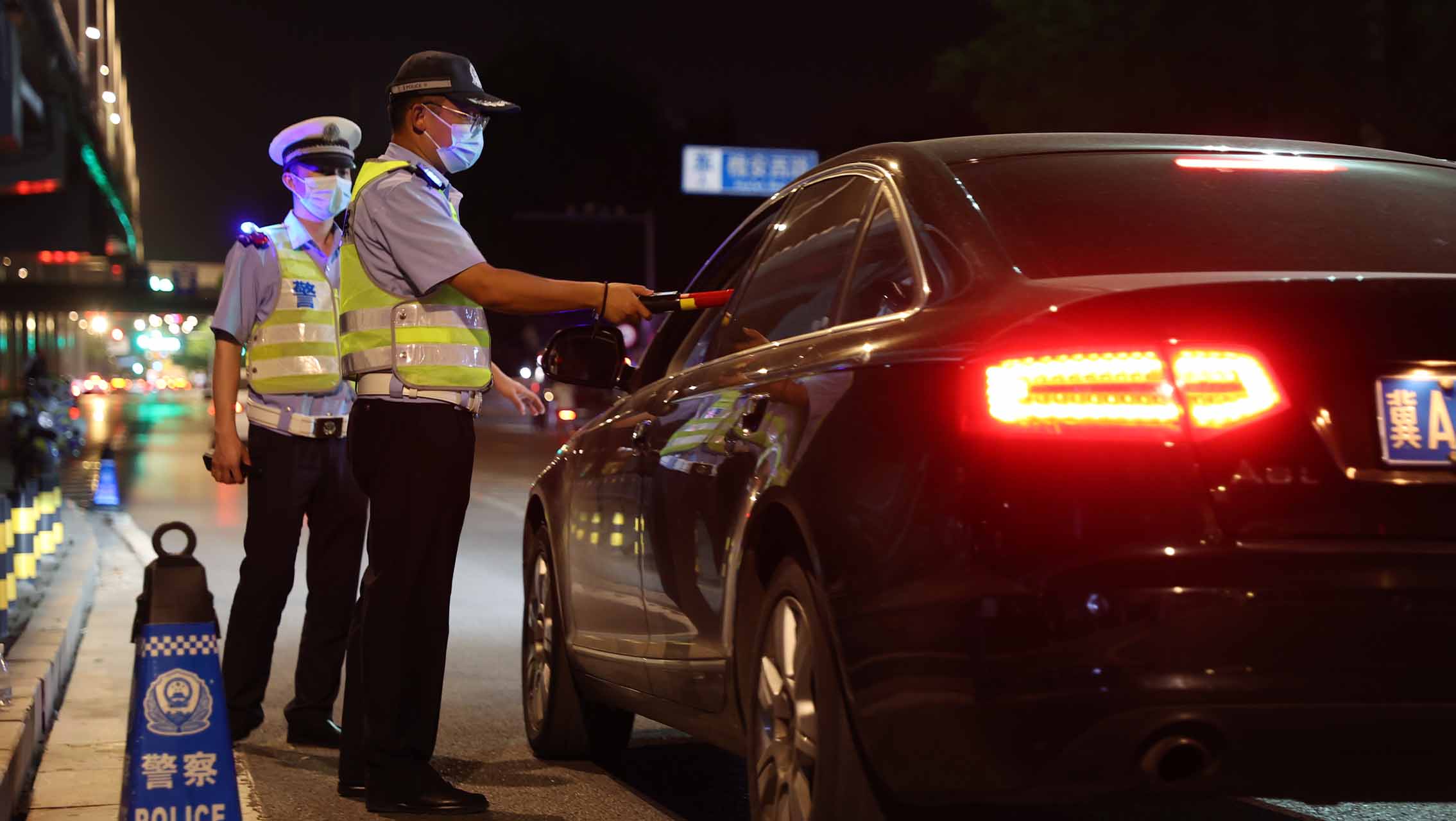 石家莊橋西交警大隊(duì)民警在槐安路廣平街口開(kāi)展酒駕醉駕檢查。 王浩天攝