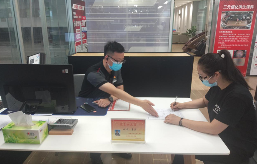 復(fù)興區(qū)澳華汽車(chē)支部黨員高賓正在為客戶(hù)服務(wù)。 連志斌攝