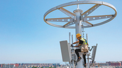 山西省運城市加快發(fā)展數(shù)字經(jīng)濟,加大5G網(wǎng)絡投資建設力度。圖為技術人員在運城市紅盾花園南5G基站點安裝調(diào)試設備。