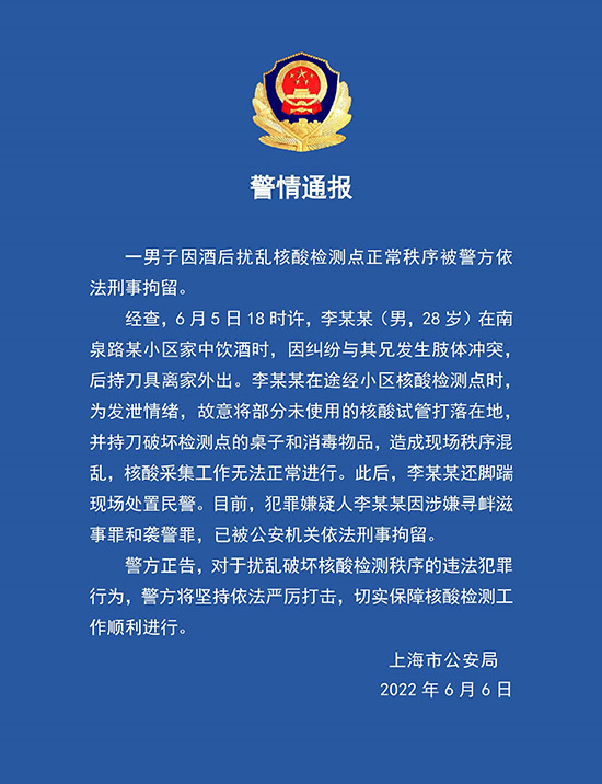 人民網(wǎng)上海6月6日電 (王文娟)據(jù)上海市公安局通報,一男子因酒后擾亂核酸檢測點正常秩序被警方依法刑事拘留。