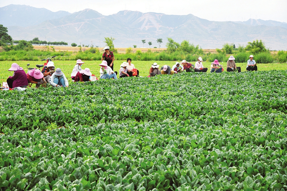 6月1日,聞喜縣后宮鄉(xiāng)新陽莊村村民正在收割大田菠菜,準備發(fā)往市場。