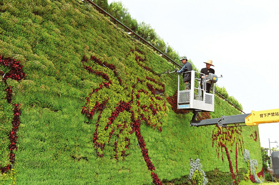 6月9日,太原植物園內(nèi),園藝師在一面布滿綠植的墻面上修剪出一幅美麗的畫(huà)卷。太原植物園開(kāi)放以來(lái),以優(yōu)美的原生態(tài)綠色景觀吸引了大批游客,成為省城綠色生態(tài)“打卡地”。(記者阮洋攝)