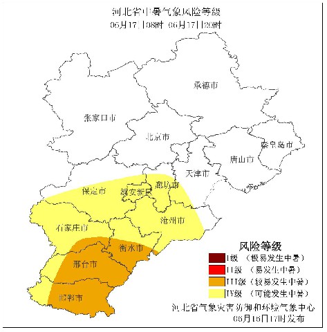 據(jù)了解,河北省氣象災(zāi)害防御和環(huán)境氣象中心2022年6月16日17時(shí)發(fā)布中暑氣象風(fēng)險(xiǎn)等級預(yù)報(bào):明天白天,保定、廊坊以南大部分地區(qū)中暑氣象風(fēng)險(xiǎn)等級在IV級及以上,可能發(fā)生中暑,其中衡水南部、邢臺和邯鄲兩市的中東部地區(qū)中暑氣象風(fēng)險(xiǎn)等級為Ⅲ級,較易發(fā)生中暑,請注意防范。