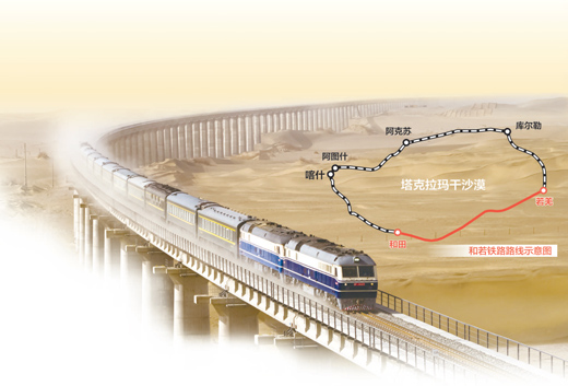 作為國(guó)家重點(diǎn)鐵路建設(shè)項(xiàng)目,和若鐵路西起新疆和田地區(qū)和田市,東至巴音郭楞蒙古自治州若羌縣,全長(zhǎng)825公里,設(shè)計(jì)時(shí)速120公里。和若鐵路開通后,與南疆鐵路、格庫鐵路相連,全長(zhǎng)2712公里,形成世界首個(gè)沙漠鐵路環(huán)線。