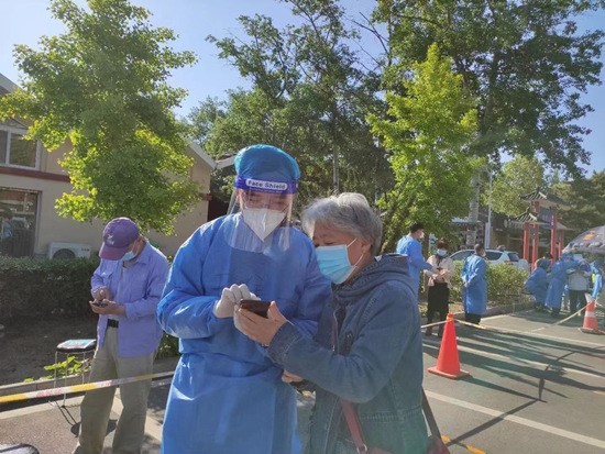 “五一”假期第一天,在通州臨河里街道華遠(yuǎn)銘悅南區(qū)核酸檢測點(diǎn),北京金控集團(tuán)下沉干部王超拍照、核對、詢問,迅速完成登記工作。老人聽力不佳,他便提高音量、耐心解釋;居民排隊(duì)距離過密,他向社區(qū)建議調(diào)整排隊(duì)通道,保證安全。相同的輸入動(dòng)作、相似的問答話語王超每天要重復(fù)近千次。