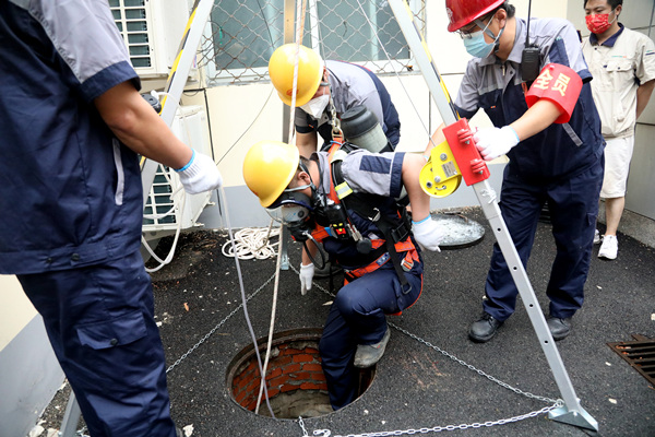 此次演練分為前期準備、有限空間規(guī)范作業(yè)及作業(yè)人員遇險科學(xué)施救流程演示三個部分。首先,參演人員依次展示了作業(yè)審批、安全交底、工具檢查、現(xiàn)場安全檢查、封閉作業(yè)區(qū)域并設(shè)置警示標志等作業(yè)前期準備工作。隨后,對有限空間出入口的有毒有害氣體、氧氣濃度進行檢測并進行自然通風(fēng)或使用機械設(shè)備進行強制通風(fēng),待監(jiān)測評估符合作業(yè)要求后,架設(shè)救援用三腳架,參演人員穿戴好有限空間作業(yè)器具并經(jīng)檢查合格后,在持續(xù)通風(fēng)并有人員進行安全監(jiān)護的條件下,下井作業(yè)。最后,為避免因有限空間作業(yè)發(fā)生事故后盲目施救而產(chǎn)生連鎖事故,由救援人員展示如何正確穿戴呼吸器等救援防護用品并確保自身安全的前提下下井救援,利用三腳架等設(shè)備將受困人員安全救出并脫離危險場所的同時呼叫救援,進行心肺復(fù)蘇等規(guī)范施救流程。