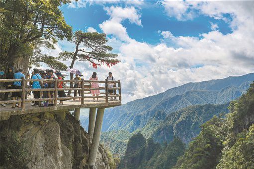 6月26日,宜章縣莽山五指峰景區(qū),游客暢游其中。隨著疫情形勢穩(wěn)定,當?shù)赝瞥鍪钇诼糜蔚认盗袃?yōu)惠政策和活動,旅游市場日漸升溫。記者 郭立亮 通訊員 鄧加亮 攝影報道