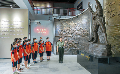 7月6日,在江蘇省泰興市新街鎮(zhèn)楊村廟烈士紀(jì)念館,少先隊員在宣泰戰(zhàn)斗浮雕前聽講解員講解。顧繼紅攝(影像中國)