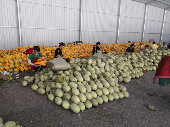 隆堯縣固城鎮(zhèn)小孟村哈密瓜收獲,瓜農(nóng)們正在挑揀包裝。 任學麗攝
