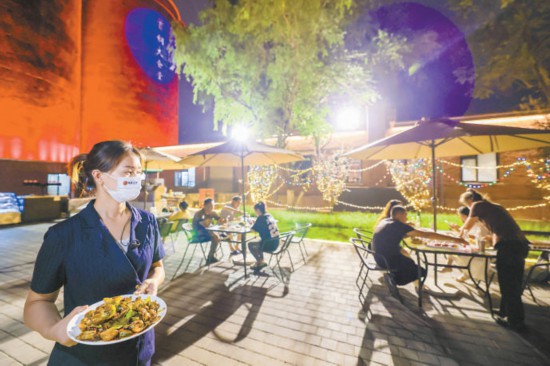 在首鋼園香格里拉,北門前的戶外“真香市集”傳來(lái)陣陣香氣,燒烤和啤酒是這里的招牌,周五至周日夜間面向顧客開放營(yíng)業(yè)。在六工匯購(gòu)物廣場(chǎng),九本居酒屋、觀和牛的戶外用餐區(qū)在夏日更受歡迎。位于瞭倉(cāng)藝術(shù)館二層的料逅餐吧,則提供露臺(tái)簡(jiǎn)餐服務(wù),餐吧營(yíng)業(yè)至夜間12點(diǎn)。