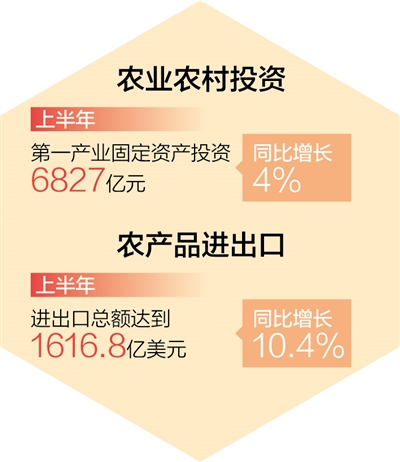 農業(yè)農村投資穩(wěn)步增長,農村消費市場逐步恢復。農業(yè)農村投資渠道拓寬。落細落實扎實穩(wěn)住經(jīng)濟一攬子政策措施,全力推動重大政策落地實施和重大工程項目開工建設。上半年,第一產業(yè)固定資產投資6827億元,同比增長4%。鄉(xiāng)村消費持續(xù)恢復。鄉(xiāng)村消費品零售額2.77萬億元,與去年基本持平,恢復到2019年的98%。農產品進出口保持增長勢頭,進出口總額達到1616.8億美元,同比增長10.4%。