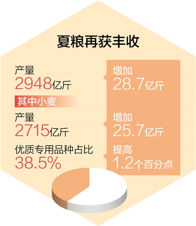 北京師范大學中國鄉(xiāng)村振興與發(fā)展研究中心主任張琦表示:“夏糧豐收離不開‘藏糧于地’‘藏糧于技’戰(zhàn)略的全面實施,今年夏糧播種面積達3.98億畝,比上年增加138萬畝,夏糧畝產比上年提高2.3公斤,單產提高對增產的貢獻達64%。”