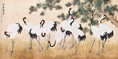 《松齡鶴壽圖》是陳之佛工筆花鳥中尺幅較大的一幅,是為慶祝中華人民共和國成立十周年的獻(xiàn)禮作。10只體態(tài)優(yōu)雅的丹頂鶴,安逸地徜徉于大地之上,或昂首唳天,或回首顧盼,或凝神遠(yuǎn)眺,蒼翠的古松由畫面右上方伸入,枝干蒼勁古樸,松枝郁郁蔥蔥,蘊含著無限生機(jī)。陳之佛在中國畫傳統(tǒng)線描基礎(chǔ)上,將西洋畫和裝飾畫的線條加以改造后融入其中,使線條的表現(xiàn)力更為豐富。