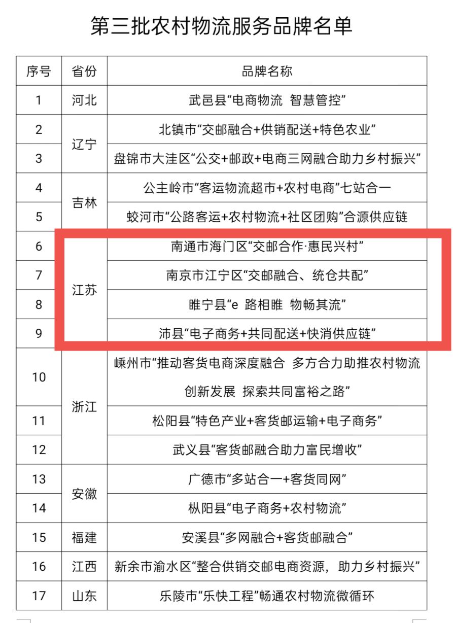 人民網(wǎng)南京10月13日電 近日,交通運(yùn)輸部辦公廳、國家郵政局辦公室聯(lián)合印發(fā)通知,發(fā)布全國第三批農(nóng)村物流服務(wù)品牌,共40個(gè)項(xiàng)目入選,覆蓋20個(gè)省份。江蘇南通市海門區(qū)“交郵合作·惠民興村”、南京市江寧區(qū)“交郵融合、統(tǒng)倉共配”、睢寧縣“e 路相睢 物暢其流”、沛縣“電子商務(wù)+共同配送+快消供應(yīng)鏈”4個(gè)項(xiàng)目名列其中。至此,江蘇已累計(jì)有8個(gè)項(xiàng)目入選全國農(nóng)村物流服務(wù)品牌,數(shù)量居全國前列。