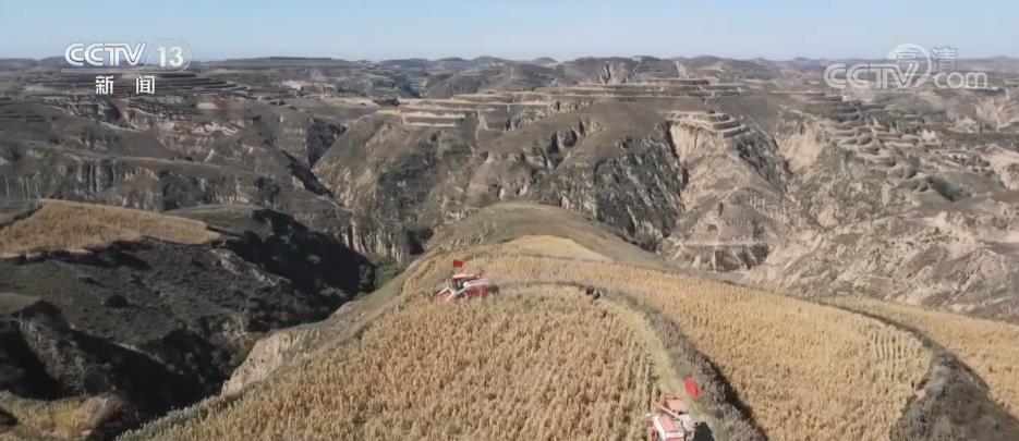 在米脂縣萬畝高標準農(nóng)田里,收割機在谷田里來回穿梭,保證顆粒歸倉。今年,當?shù)赜晁渑?,谷穗籽粒飽滿、長勢喜人,預(yù)計今年谷子畝產(chǎn)將達到800斤,每畝較去年增收900到1000元。