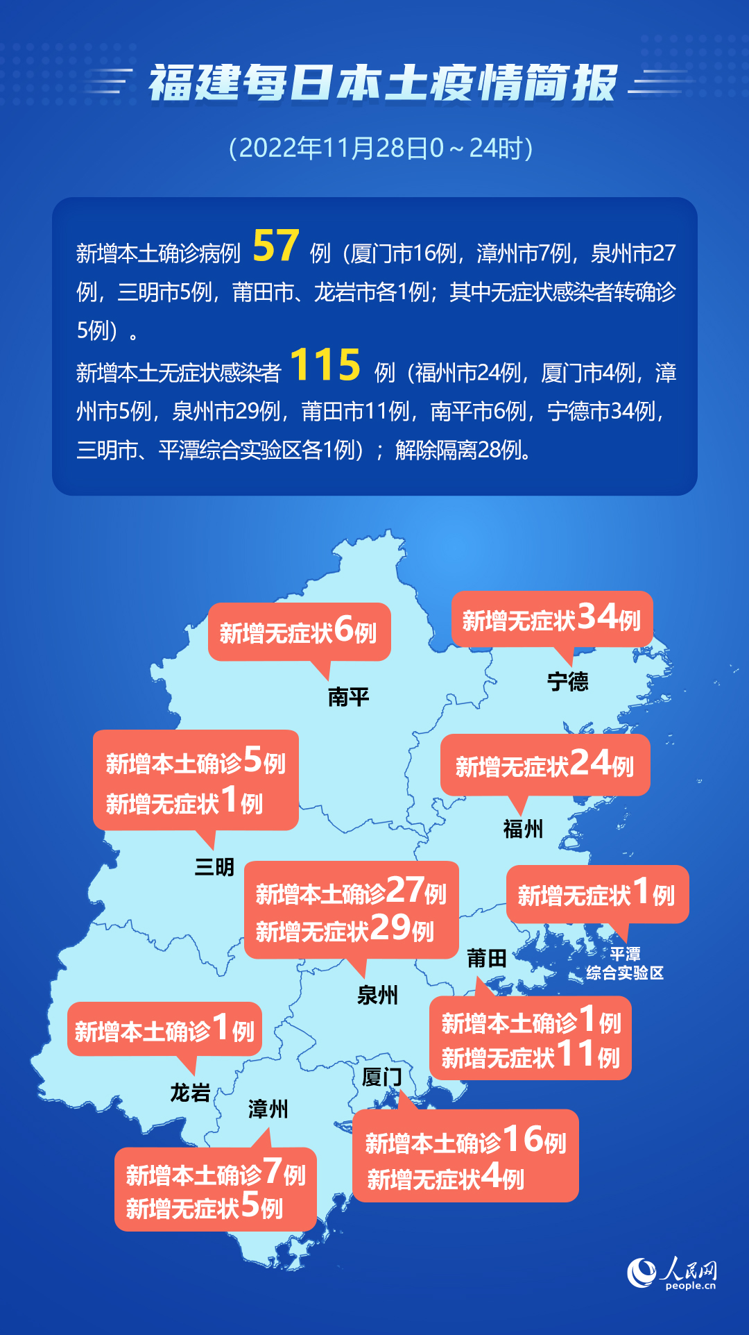 人民網福州11月29日電 (江葦杭、陳永整)據福建省衛(wèi)健委網站消息,11月28日0-24時,福建省報告新增本土確診病例新增本土確診病例57例(廈門市16例,漳州市7例,泉州市27例,三明市5例,莆田市、龍巖市各1例;其中無癥狀感染者轉確診5例)。當日報告新增本土無癥狀感染者115例(福州市24例,廈門市4例,漳州市5例,泉州市29例,莆田市11例,南平市6例,寧德市34例,三明市、平潭綜合實驗區(qū)各1例);解除隔離28例。全省本土確診病例目前住院365例,無死亡病例;現有本土無癥狀感染者尚在接受集中隔離醫(yī)學觀察623例。