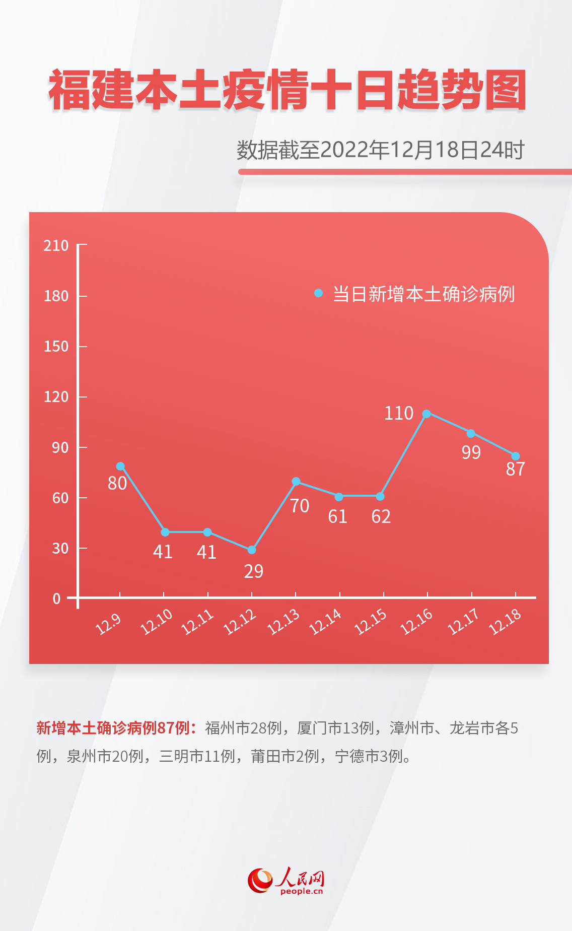 人民網(wǎng)福州12月19日電 (江葦杭、陳永整)據(jù)福建省衛(wèi)健委網(wǎng)站消息,12月18日0-24時,福建省報告新增本土確診病例87例(福州市28例,廈門市13例,漳州市、龍巖市各5例,泉州市20例,三明市11例,莆田市2例,寧德市3例)。目前,全省本土確診病例住院563例,無死亡病例。