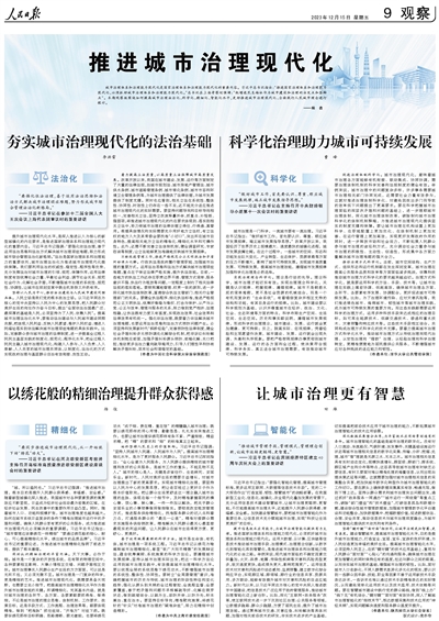城市治理體系和治理能力現(xiàn)代化是國(guó)家治理體系和治理能力現(xiàn)代化的重要內(nèi)容。習(xí)近平總書記指出:“推進(jìn)國(guó)家治理體系和治理能力現(xiàn)代化,必須抓好城市治理體系和治理能力現(xiàn)代化。”總書記在上??疾鞎r(shí)強(qiáng)調(diào):“把增進(jìn)民生福祉作為城市建設(shè)和治理的出發(fā)點(diǎn)和落腳點(diǎn)”。本期觀察版圍繞如何提高城市治理法治化、科學(xué)化、精細(xì)化、智能化水平,更好推進(jìn)城市治理現(xiàn)代化、全面踐行人民城市理念進(jìn)行探討。