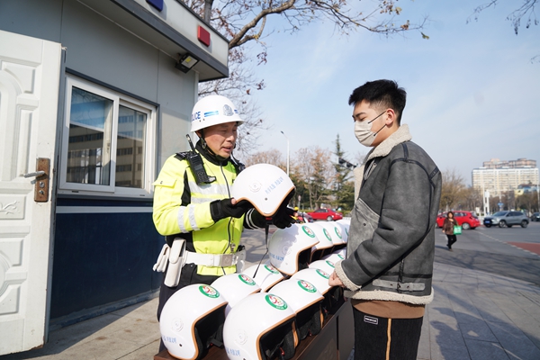 群眾在掃碼借用“共享頭盔”時,系統(tǒng)自動推送交通安全宣傳提示信息,實(shí)現(xiàn)借用一次頭盔、接受一次教育。(張晉 田廷江)