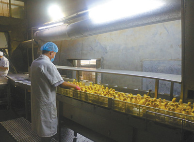 從孵化到養(yǎng)殖,從飼料到屠宰,榮達(dá)公司每個環(huán)節(jié)都嚴(yán)格控制,著力打造高質(zhì)量鴨肉品牌?!耙屜M(fèi)者吃得營養(yǎng)、吃得健康。”牛廣峰說。在優(yōu)質(zhì)肉鴨新品種培育方面,榮達(dá)公司建成了標(biāo)準(zhǔn)化育種場,主要用于優(yōu)質(zhì)雙黑白羽肉鴨選育,實(shí)現(xiàn)孵化場——養(yǎng)殖戶——屠宰廠——飼料廠產(chǎn)業(yè)鏈運(yùn)作經(jīng)營模式,各個環(huán)節(jié)協(xié)同推進(jìn)。