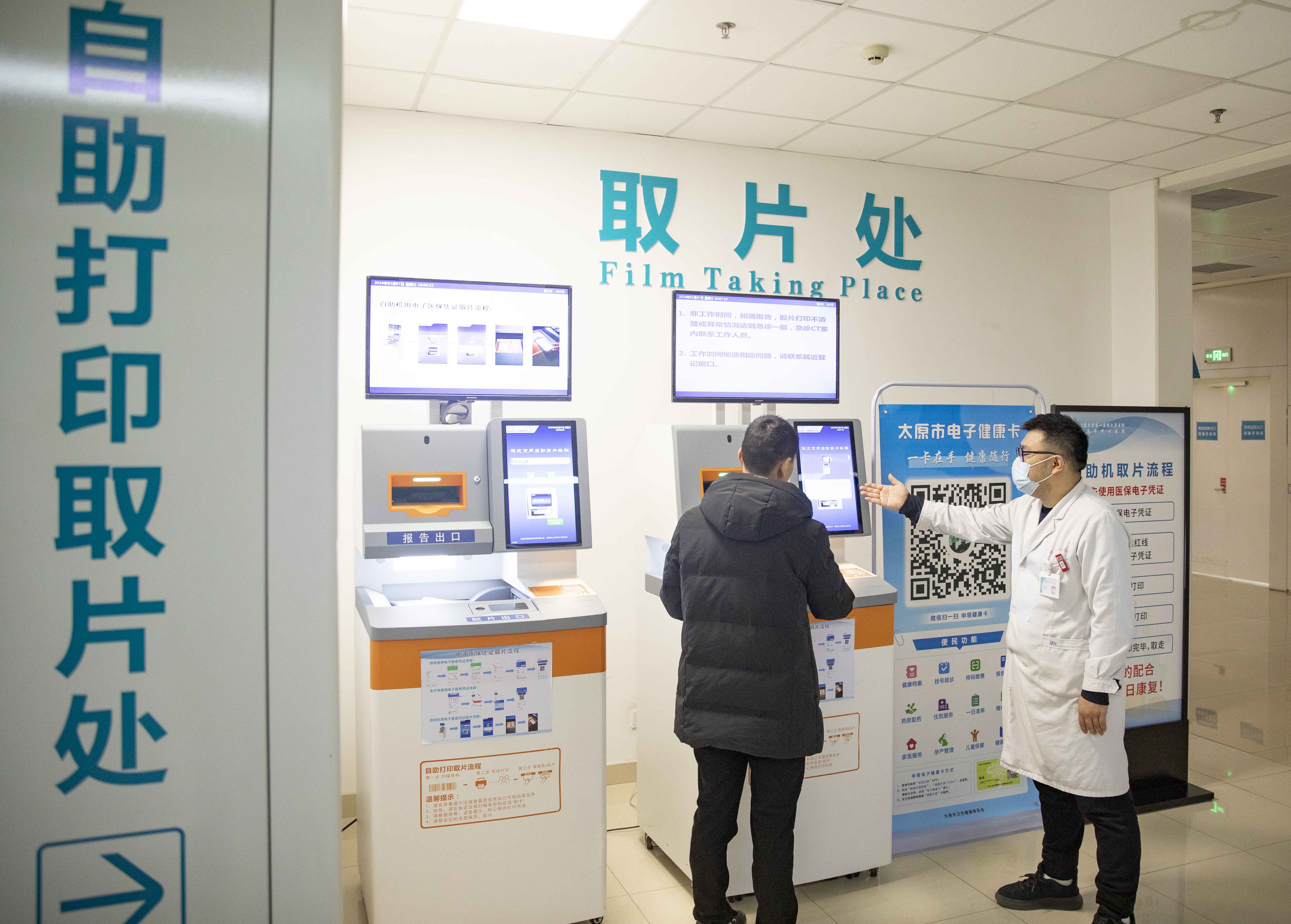 北大醫(yī)院太原醫(yī)院(市中心醫(yī)院)汾東院區(qū)醫(yī)護人員指導患者使電子健康卡自助掃碼取片。人民網(wǎng)記者王帆攝