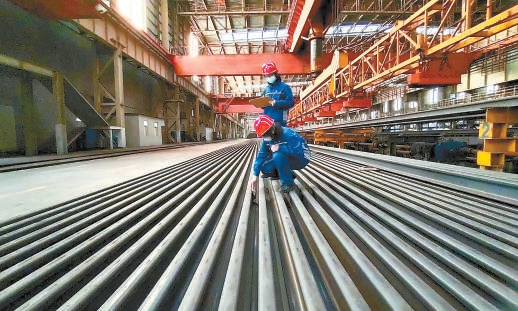 河鋼邯鋼大型軋鋼廠技術人員正在檢查將要出廠的重軌產品質量。